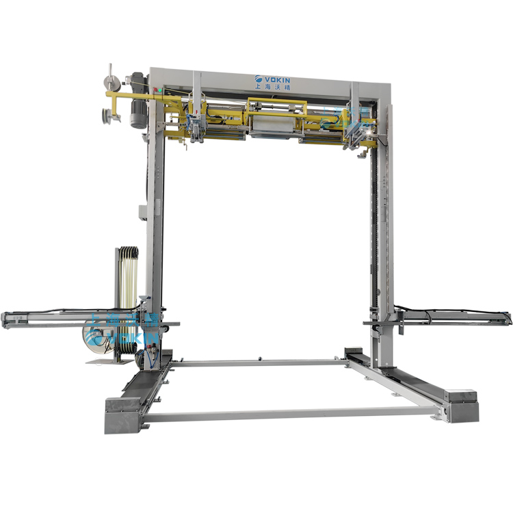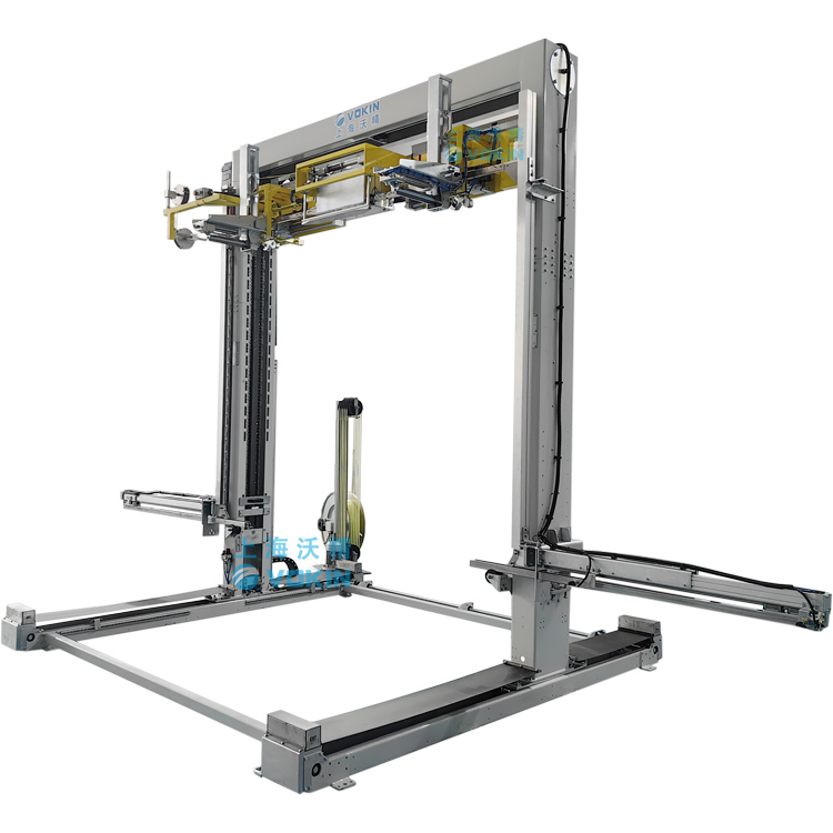 移動式打帶機可以自動尋找打帶位置并且配合打帶機底部的旋轉臺輸送機,可以完成井字型打帶,并且可短護角保護產品不被打包帶損傷。